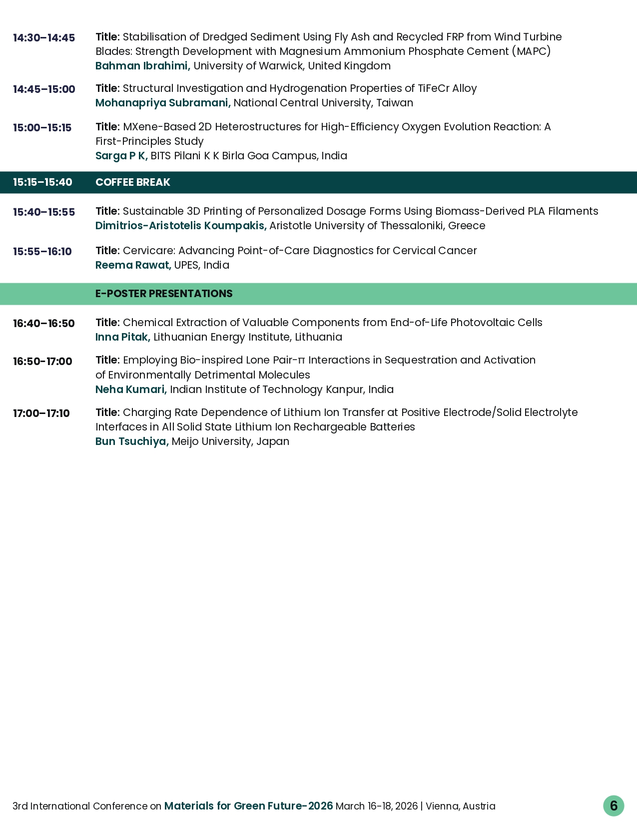 Thank you for the conference organization. I agree that the relationship and collaborations fostered is important and please let me know if there is any follow up conference with Green Materials Conference.
